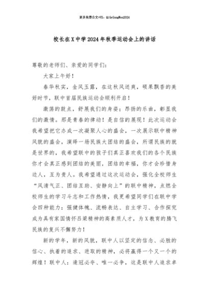 / 【七哥公文】2024年:校长在X中学2024年秋季运动会上的讲话+更多免费公文+VX:QiGeGongWen2024