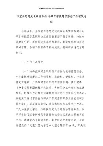 【七哥公文】2024年:市宣传思想文化战线2024年第三季度意识形态工作情况总结+更多免费公文+VX:QiGeGongWen2024