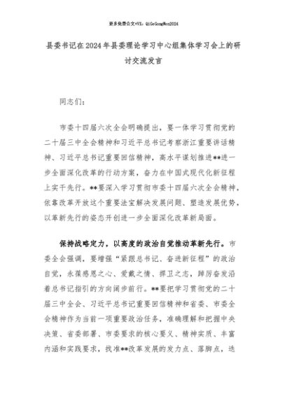 【七哥公文】2024年:县委书记在2024年县委理论学习中心组集体学习会上的研讨交流发言+更多免费公文+VX:QiGeGongWen2024
