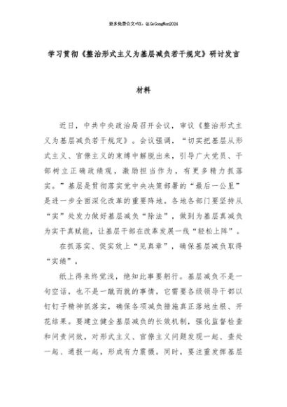 【七哥公文】2024年:学习贯彻《整治形式主义为基层减负若干规定》研讨发言材料+更多免费公文+VX:QiGeGongWen2024