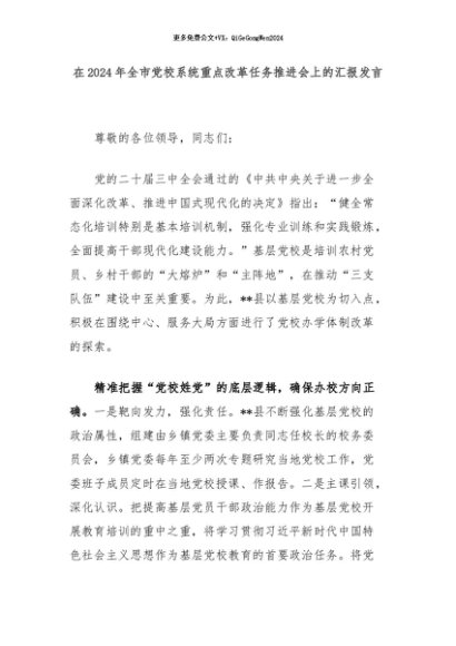 【七哥公文】2024年:在2024年全市党校系统重点改革任务推进会上的汇报发言+更多免费公文+VX:QiGeGongWen2024