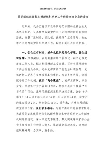 【七哥公文】2024年:县委组织部部长在两新组织党建工作经验交流会上的发言+更多免费公文+VX:QiGeGongWen2024