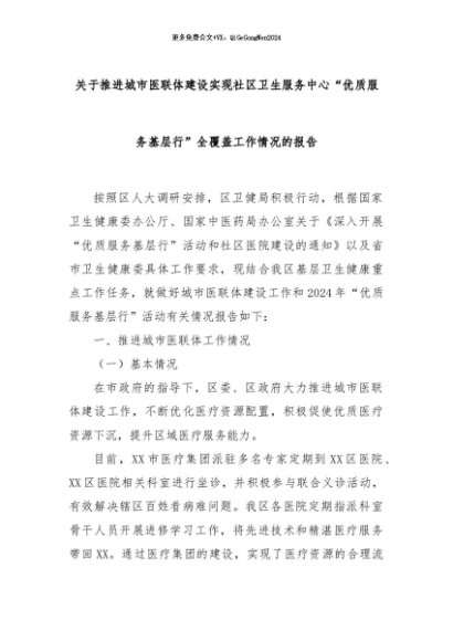 【七哥公文】2024年:关于推进城市医联体建设实现社区卫生服务中心“优质服务基层行”全覆盖工作情况的报告+更多免费公文+VX:QiGeGongWen2024
