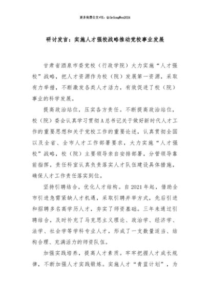 / 【七哥公文】2024年:研讨发言:实施人才强校战略推动党校事业发展+更多免费公文+VX:QiGeGongWen2024