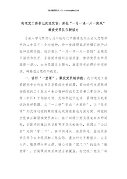 【七哥公文】2024年:街道党工委书记交流发言:深化“一月一课一片一实践” 激发党员队伍新活力+更多免费公文+VX:QiGeGongWen2024