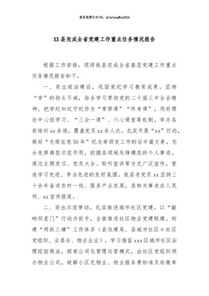 / 【七哥公文】2024年:XX县完成全省党建工作重点任务情况报告+更多免费公文+VX:QiGeGongWen2024
