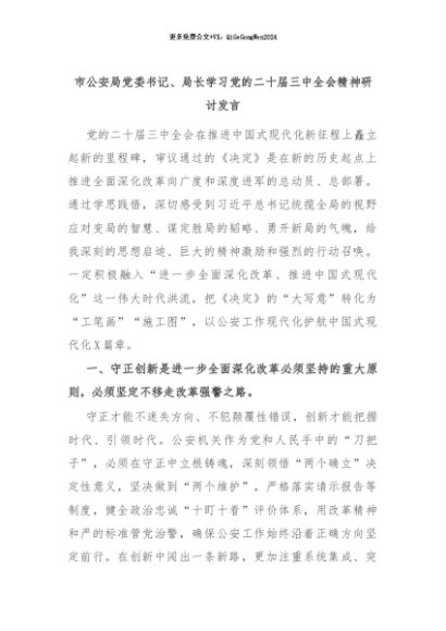【七哥公文】2024年:市公安局党委书记、局长学习党的二十届三中全会精神研讨发言+更多免费公文+VX:QiGeGongWen2024