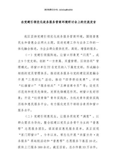 / 【七哥公文】2024年:在党建引领优化政务服务营商环境研讨会上的交流发言+更多免费公文+VX:QiGeGongWen2024
