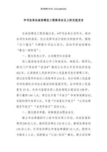 / 【七哥公文】2024年:市司法局在诚信建设工程推进会议上的交流发言+更多免费公文+VX:QiGeGongWen2024