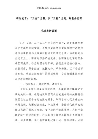 【七哥公文】2024年:研讨发言:“三有”为墨,以“三新”为笔,绘制全面深化改革新蓝图+更多免费公文+VX:QiGeGongWen2024