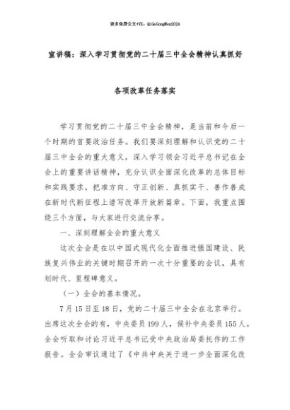 【七哥公文】2024年:宣讲稿:深入学习贯彻党的二十届三中全会精神认真抓好各项改革任务落实+更多免费公文+VX:QiGeGongWen2024