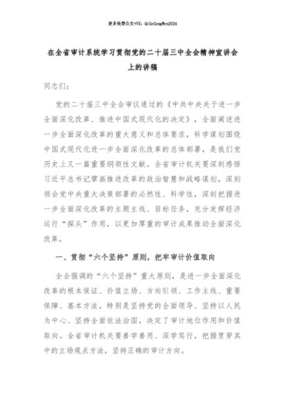 【七哥公文】2024年:在全省审计系统学习贯彻党的二十届三中全会精神宣讲会上的讲稿+更多免费公文+VX:QiGeGongWen2024