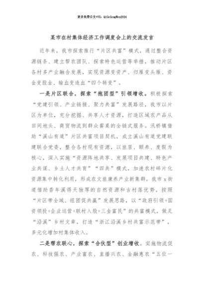 / 【七哥公文】2024年:某市在村集体经济工作调度会上的交流发言+更多免费公文+VX:QiGeGongWen2024