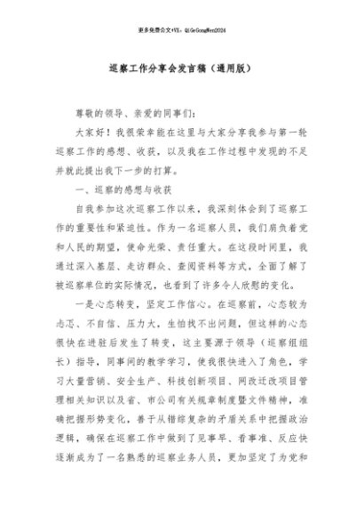 / 【七哥公文】2024年:巡察工作分享会发言稿(通用版)+更多免费公文+VX:QiGeGongWen2024