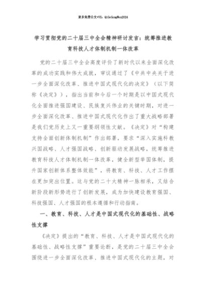 【七哥公文】2024年:学习贯彻党的二十届三中全会精神研讨发言:统筹推进教育科技人才体制机制一体改革+更多免费公文+VX:QiGeGongWen2024