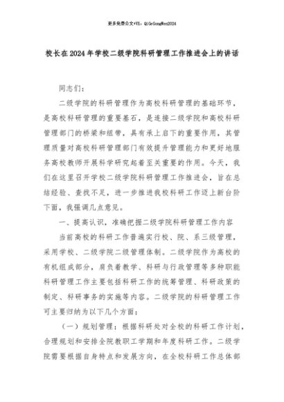 【七哥公文】2024年:校长在2024年学校二级学院科研管理工作推进会上的讲话+更多免费公文+VX:QiGeGongWen2024