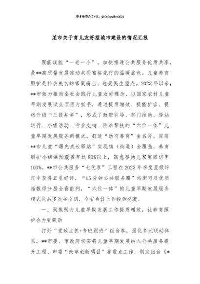 / 【七哥公文】2024年:某市关于育儿友好型城市建设的情况汇报+更多免费公文+VX:QiGeGongWen2024