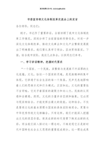 / 【七哥公文】2024年:市委宣传部文化体制改革交流会上的发言+更多免费公文+VX:QiGeGongWen2024