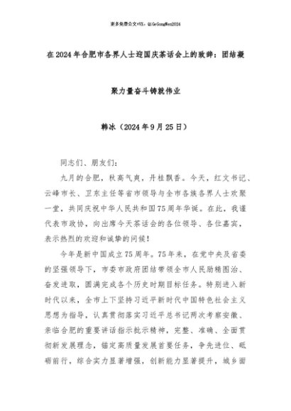 【七哥公文】2024年:在2024年合肥市各界人士迎国庆茶话会上的致辞:团结凝聚力量奋斗铸就伟业+更多免费公文+VX:QiGeGongWen2024