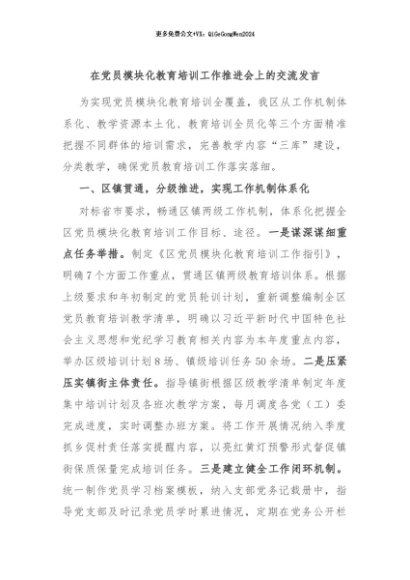 / 【七哥公文】2024年:在党员模块化教育培训工作推进会上的交流发言+更多免费公文+VX:QiGeGongWen2024