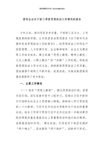 / 【七哥公文】2024年:国有企业关于前三季度思想政治工作情况的报告+更多免费公文+VX:QiGeGongWen2024
