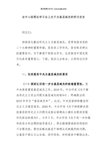 / 【七哥公文】2024年:在中心组理论学习会上关于为基层减负的研讨发言+更多免费公文+VX:QiGeGongWen2024