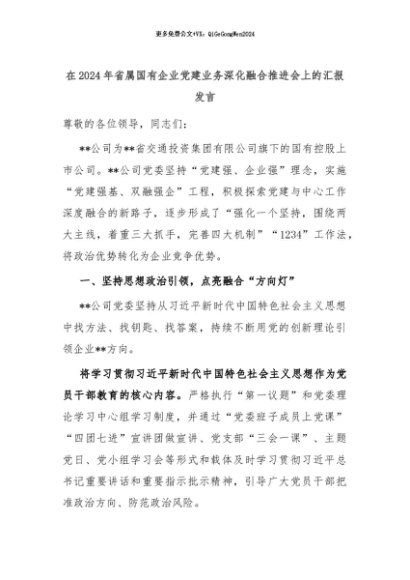 【七哥公文】2024年:在2024年省属国有企业党建业务深化融合推进会上的汇报发言+更多免费公文+VX:QiGeGongWen2024