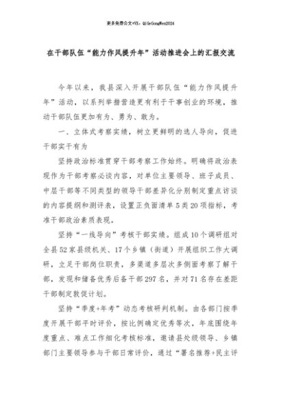 【七哥公文】2024年:在干部队伍“能力作风提升年”活动推进会上的汇报交流+更多免费公文+VX:QiGeGongWen2024