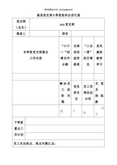 / 【七哥公文】2024年:基层党支部X季度组织生活汇报+更多免费公文+VX:QiGeGongWen2024
