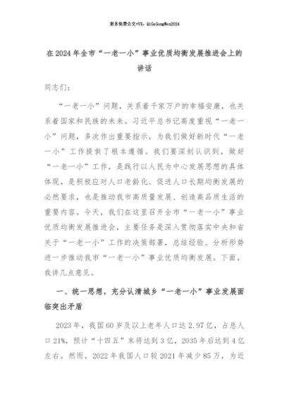 【七哥公文】2024年:在2024年全市“一老一小”事业优质均衡发展推进会上的讲话+更多免费公文+VX:QiGeGongWen2024