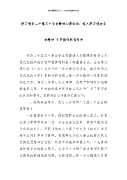 【七哥公文】2024年:学习党的二十届三中全会精神心得体会:深入学习领会全会精神 立足岗位担当作为+更多免费公文+VX:QiGeGongWen2024