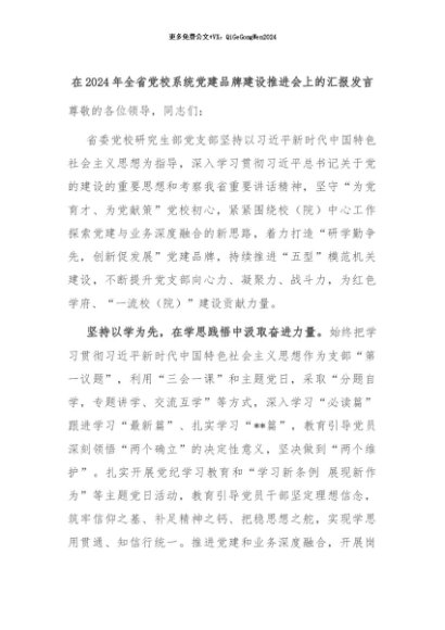 【七哥公文】2024年:在2024年全省党校系统党建品牌建设推进会上的汇报发言+更多免费公文+VX:QiGeGongWen2024