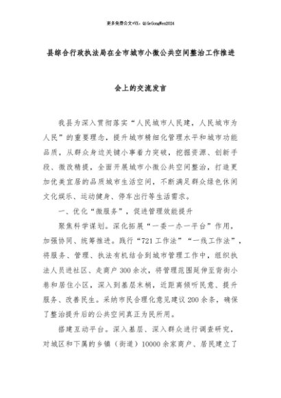 【七哥公文】2024年:县综合行政执法局在全市城市小微公共空间整治工作推进会上的交流发言+更多免费公文+VX:QiGeGongWen2024