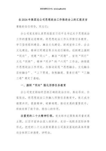 【七哥公文】2024年:在2024年集团总公司思想政治工作推进会上的汇报发言+更多免费公文+VX:QiGeGongWen2024