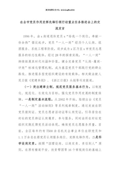 【七哥公文】2024年:在全市党员作用发挥先锋引领行动重点任务推进会上的交流发言+更多免费公文+VX:QiGeGongWen2024
