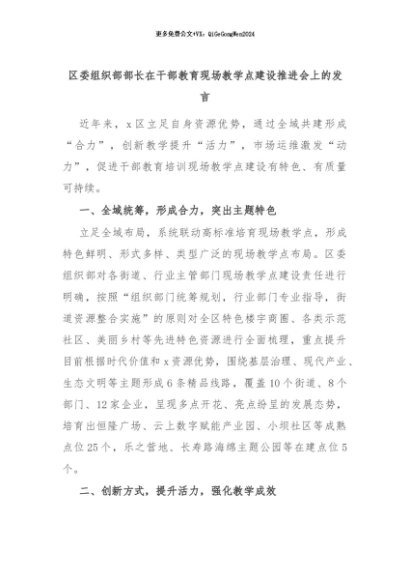 【七哥公文】2024年:区委组织部部长在干部教育现场教学点建设推进会上的发言+更多免费公文+VX:QiGeGongWen2024