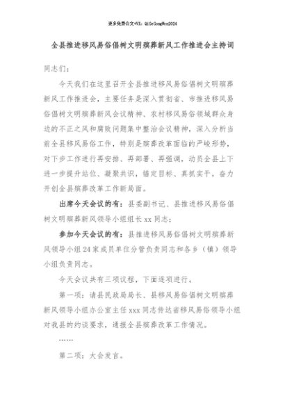 / 【七哥公文】2024年:全县推进移风易俗倡树文明殡葬新风工作推进会主持词+更多免费公文+VX:QiGeGongWen2024