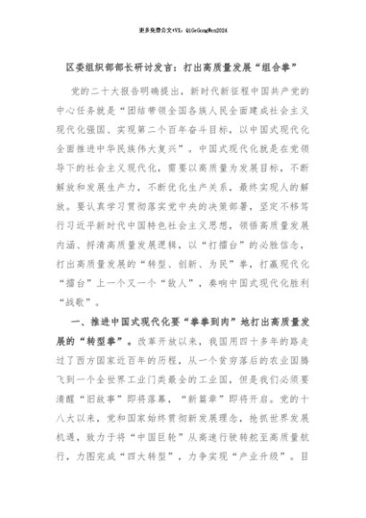 / 【七哥公文】2024年:区委组织部部长研讨发言:打出高质量发展“组合拳”+更多免费公文+VX:QiGeGongWen2024