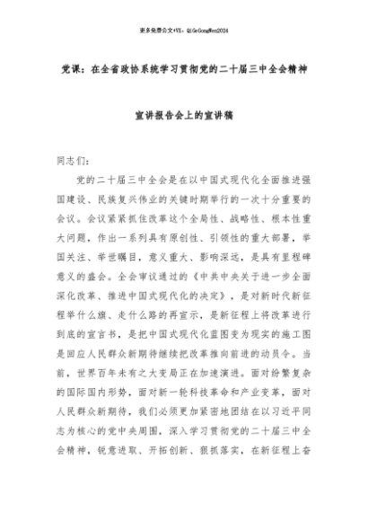 【七哥公文】2024年:党课:在全省政协系统学习贯彻党的二十届三中全会精神宣讲报告会上的宣讲稿+更多免费公文+VX:QiGeGongWen2024