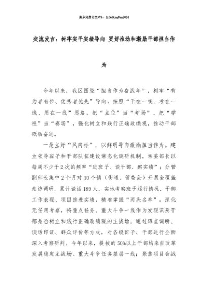 【七哥公文】2024年:交流发言:树牢实干实绩导向 更好推动和激励干部担当作为+更多免费公文+VX:QiGeGongWen2024