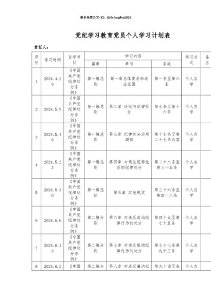 【七哥公文】2024年:党纪学习教育党员个人学习计划表+更多免费公文+VX:QiGeGongWen2024