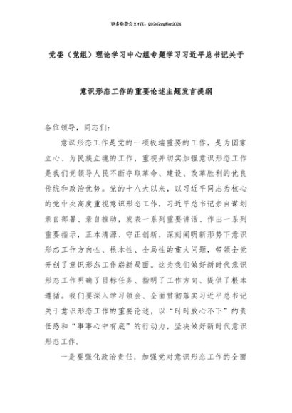 【七哥公文】2024年:党委(党组)理论学习中心组专题学习习近平总书记关于意识形态工作的重要论述主题发言提纲+更多免费公文+VX:QiGeGongWen2024