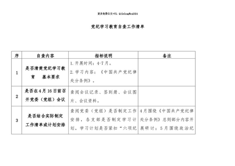 / 【七哥公文】2024年:党纪学习教育自查工作清单+更多免费公文+VX:QiGeGongWen2024