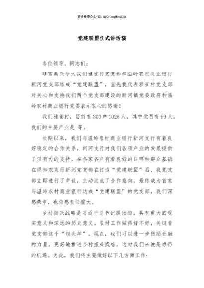 / 【七哥公文】2024年:党建联盟仪式讲话稿+更多免费公文+VX:QiGeGongWen2024