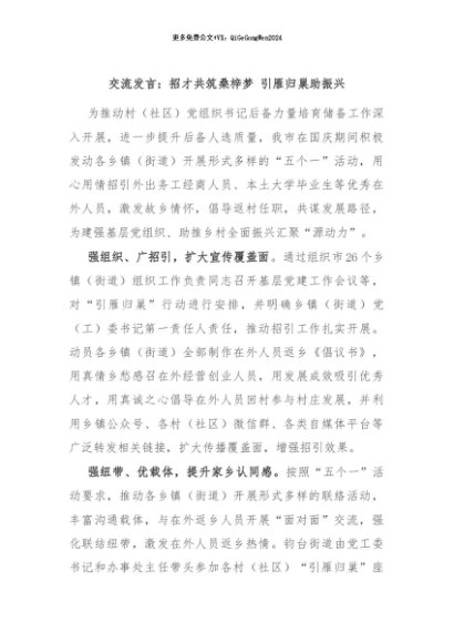 / 【七哥公文】2024年:交流发言:招才共筑桑梓梦 引雁归巢助振兴+更多免费公文+VX:QiGeGongWen2024