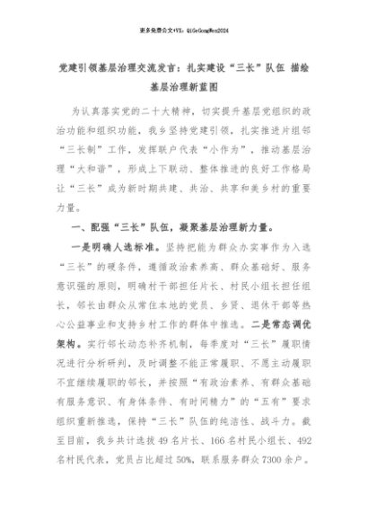 【七哥公文】2024年:党建引领基层治理交流发言:扎实建设“三长”队伍 描绘基层治理新蓝图+更多免费公文+VX:QiGeGongWen2024