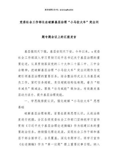 【七哥公文】2024年:党委社会工作部长在破解基层治理“小马拉大车”突出问题专题会议上的汇报发言+更多免费公文+VX:QiGeGongWen2024