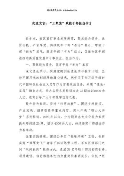 / 【七哥公文】2024年:交流发言:“三聚焦”赋能干部担当作为+更多免费公文+VX:QiGeGongWen2024