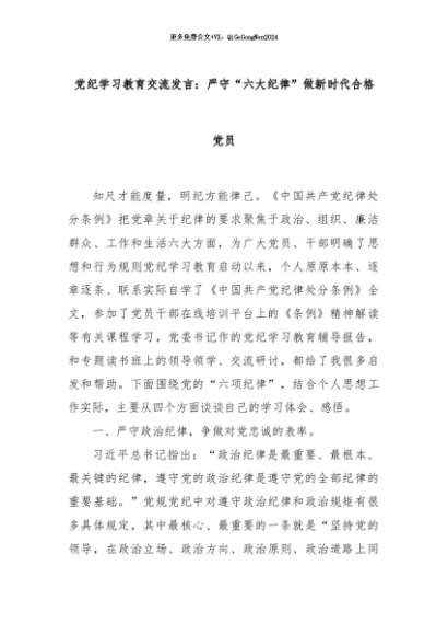【七哥公文】2024年:党纪学习教育交流发言:严守“六大纪律”做新时代合格党员+更多免费公文+VX:QiGeGongWen2024