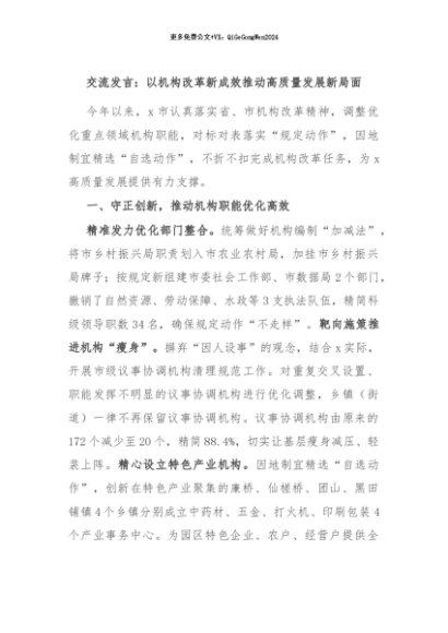 / 【七哥公文】2024年:交流发言:以机构改革新成效推动高质量发展新局面+更多免费公文+VX:QiGeGongWen2024